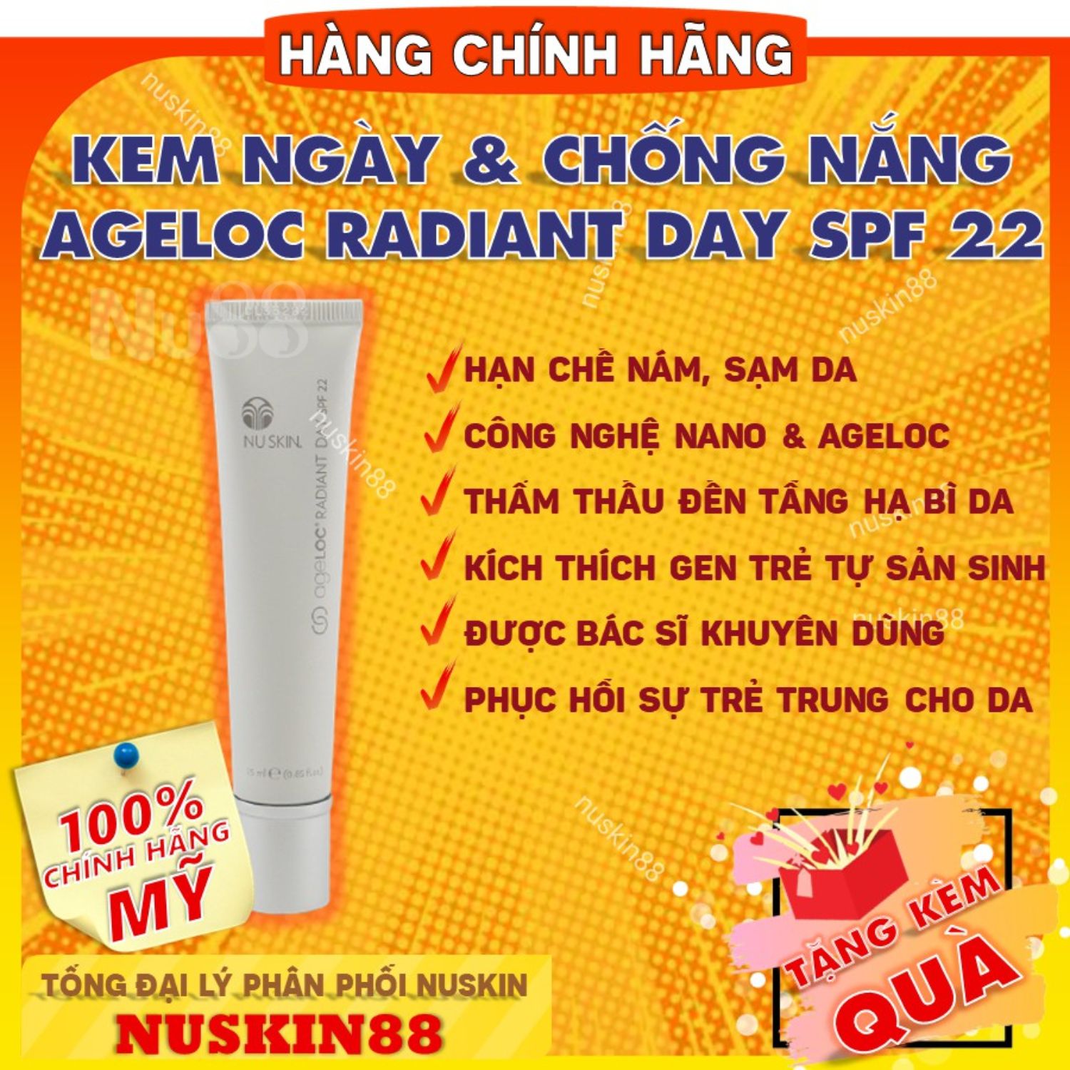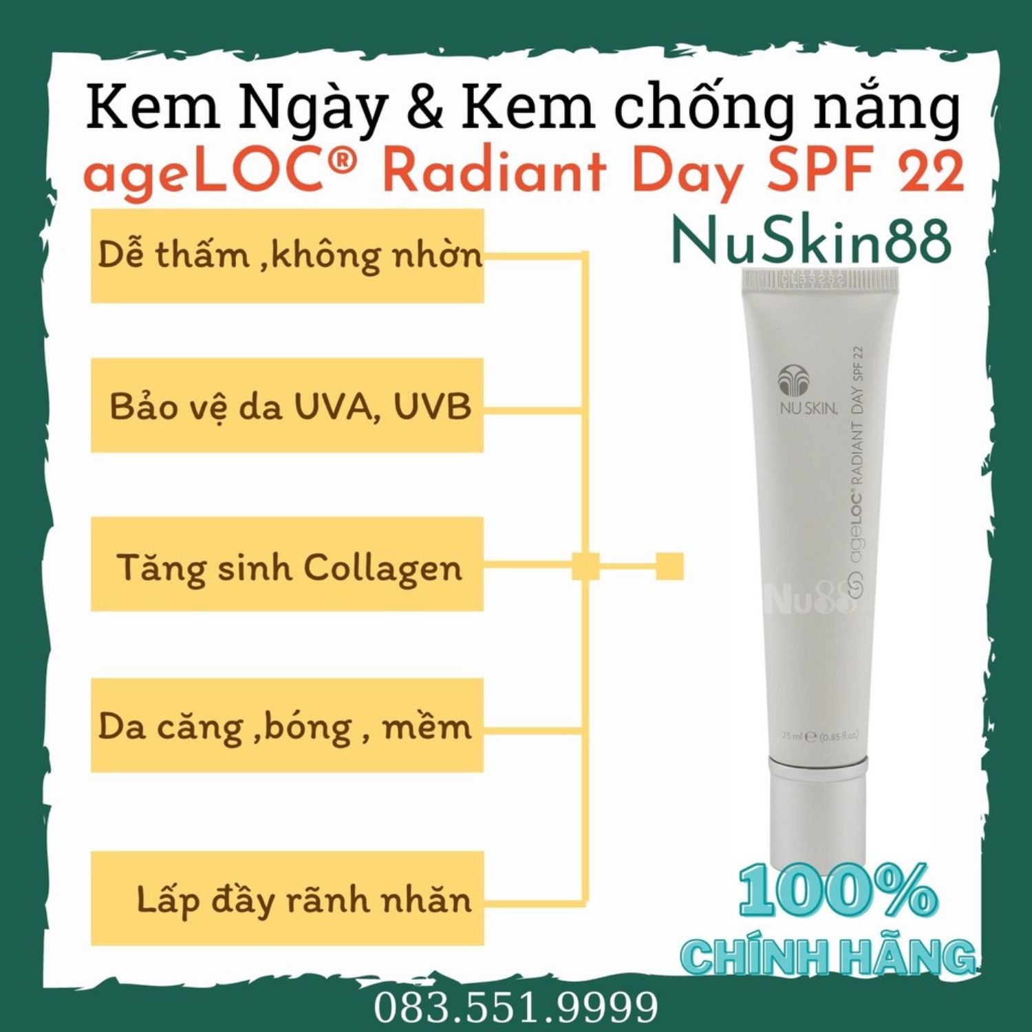 Kem chống nắng và dưỡng da ban ngày ageLOC Radiant Day SPF 22 là sản phẩm chăm sóc da kết hợp giữa khả năng dưỡng ẩm và bảo vệ da khỏi tác hại của tia UV. Sản phẩm này được phát triển với công nghệ ageLOC độc quyền từ Nu Skin, giúp làm giảm sự xuất hiện của các dấu hiệu lão hóa, mang lại làn da mịn màng, rạng rỡ và bảo vệ da khỏi tác động làm khô da của ánh nắng mặt trời.